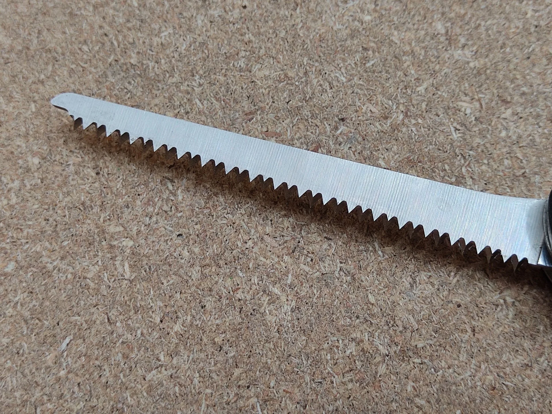 かっこよく言えばソーブレード。要するにのこぎり。猪や鹿の内蔵を抜くとき、骨盤を切断するのに使う。だから、ハンティング用のものは先端が腸を傷つけないように丸くなっていたりする。